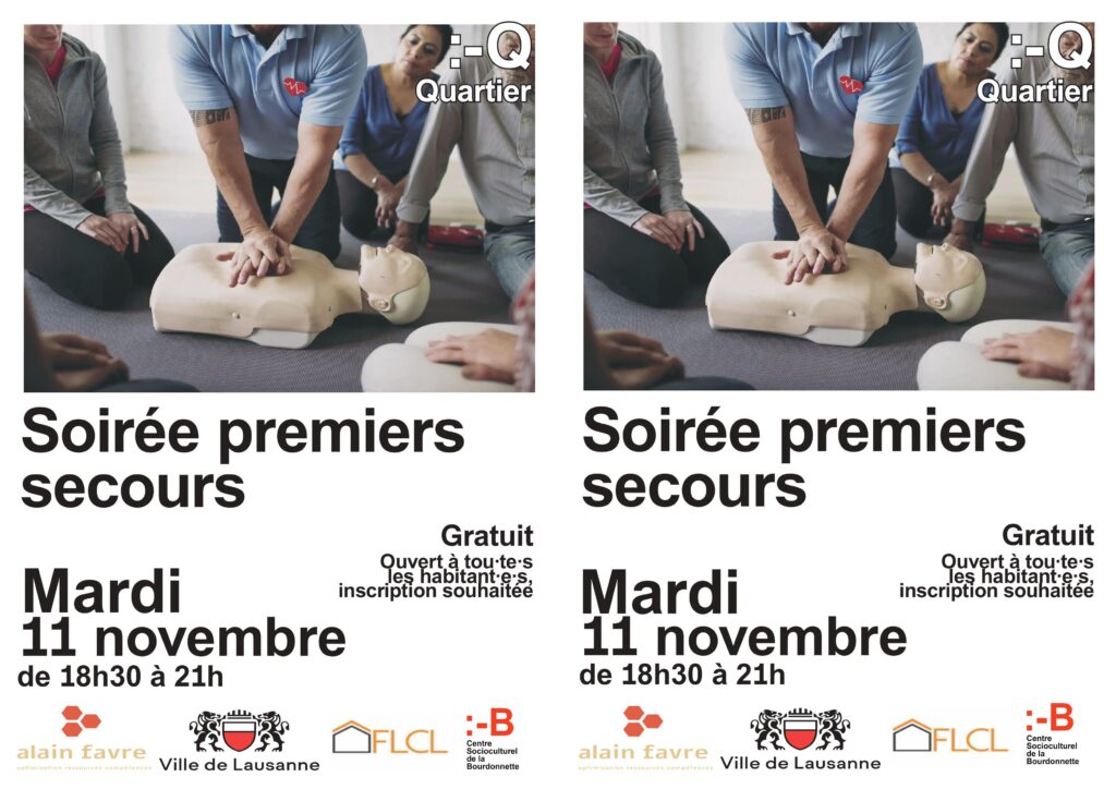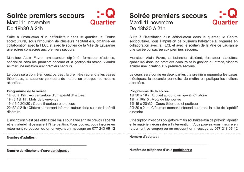 Suite à l’installation d’un défibrillateur dans le quartier, le Centre socioculturel, sous l’impulsion de plusieurs habitant·e·s, organise en collaboration avec la FLCL et avec le soutien de la Ville de Lausanne une soirée consacrée aux premiers secours.